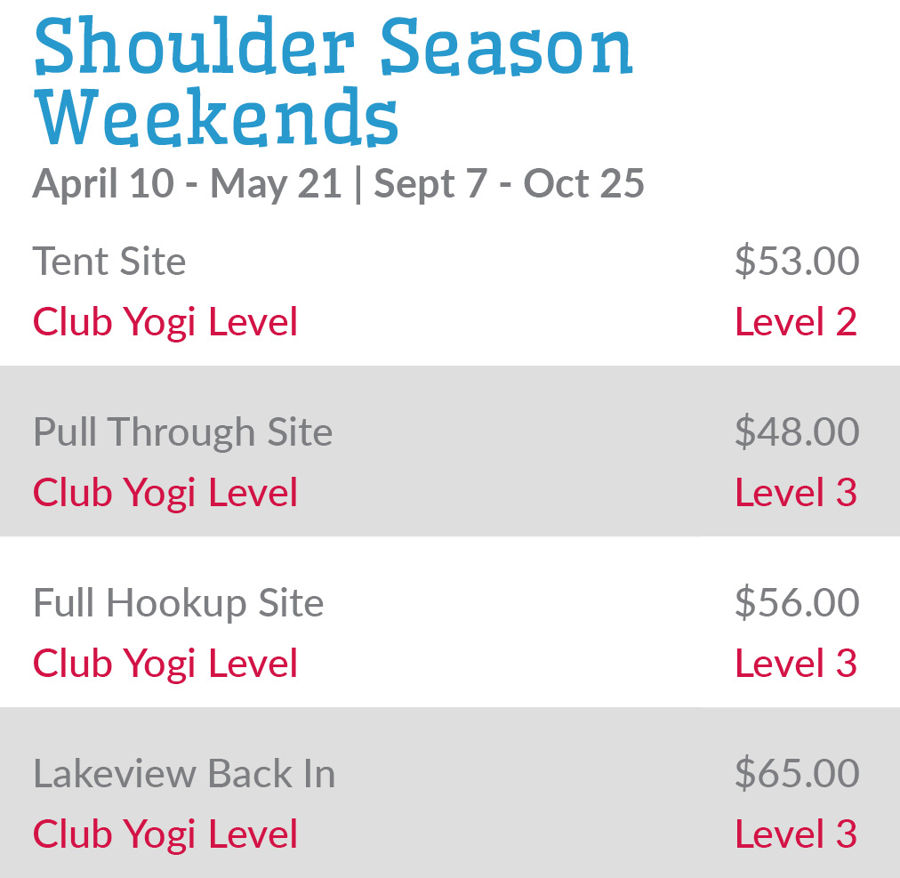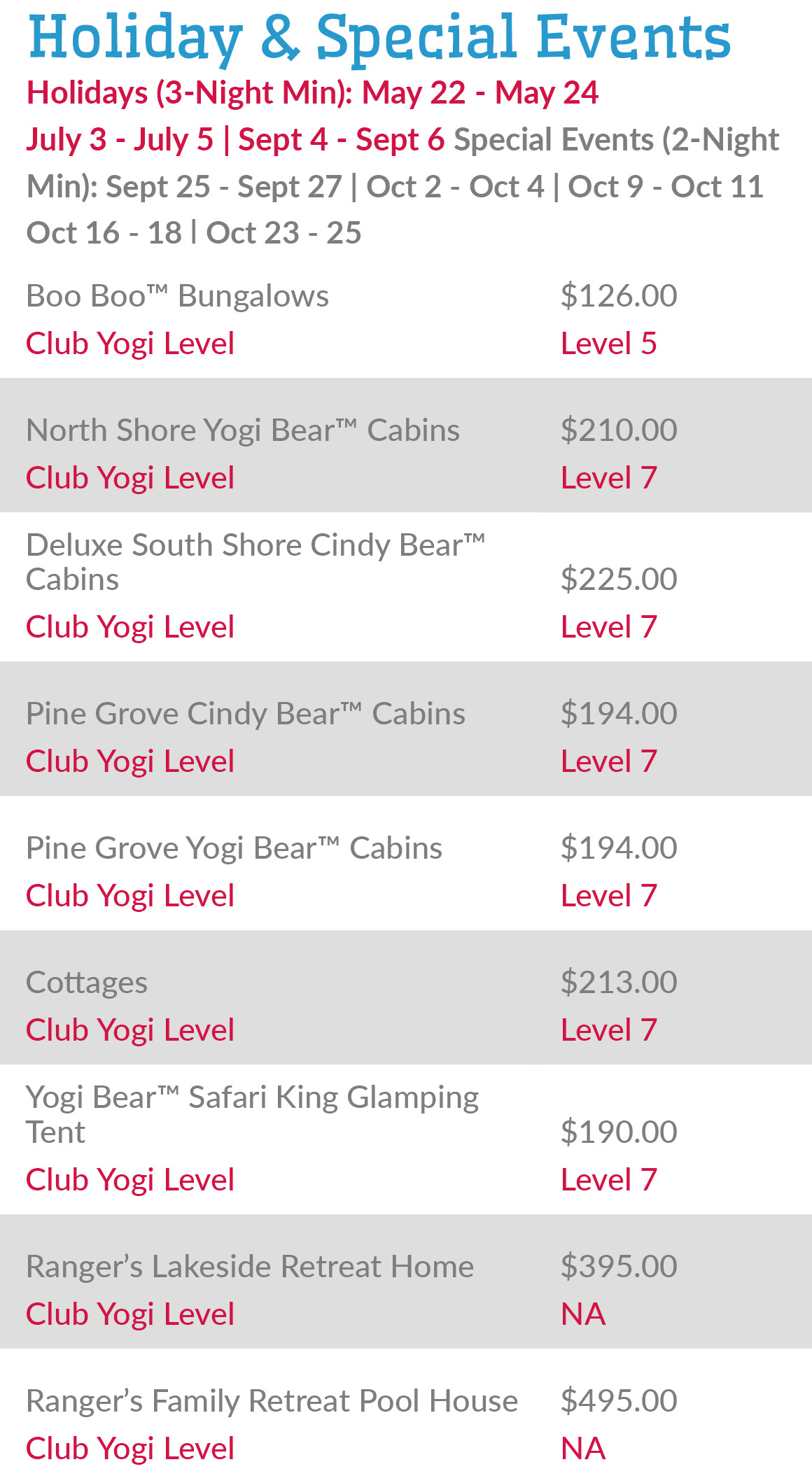 • Rates for North Shore Yogi Bear™ Cabin, Pine Grove Yogi Bear™ Cabin and Lakefront Yogi Bear Cabins are based on one (1) family. A family is defined as 2 adults and 4 dependent children (17 years old and younger). North Shore Yogi Bear™ Cabin can hold 6 people total with a max of 2 adults.