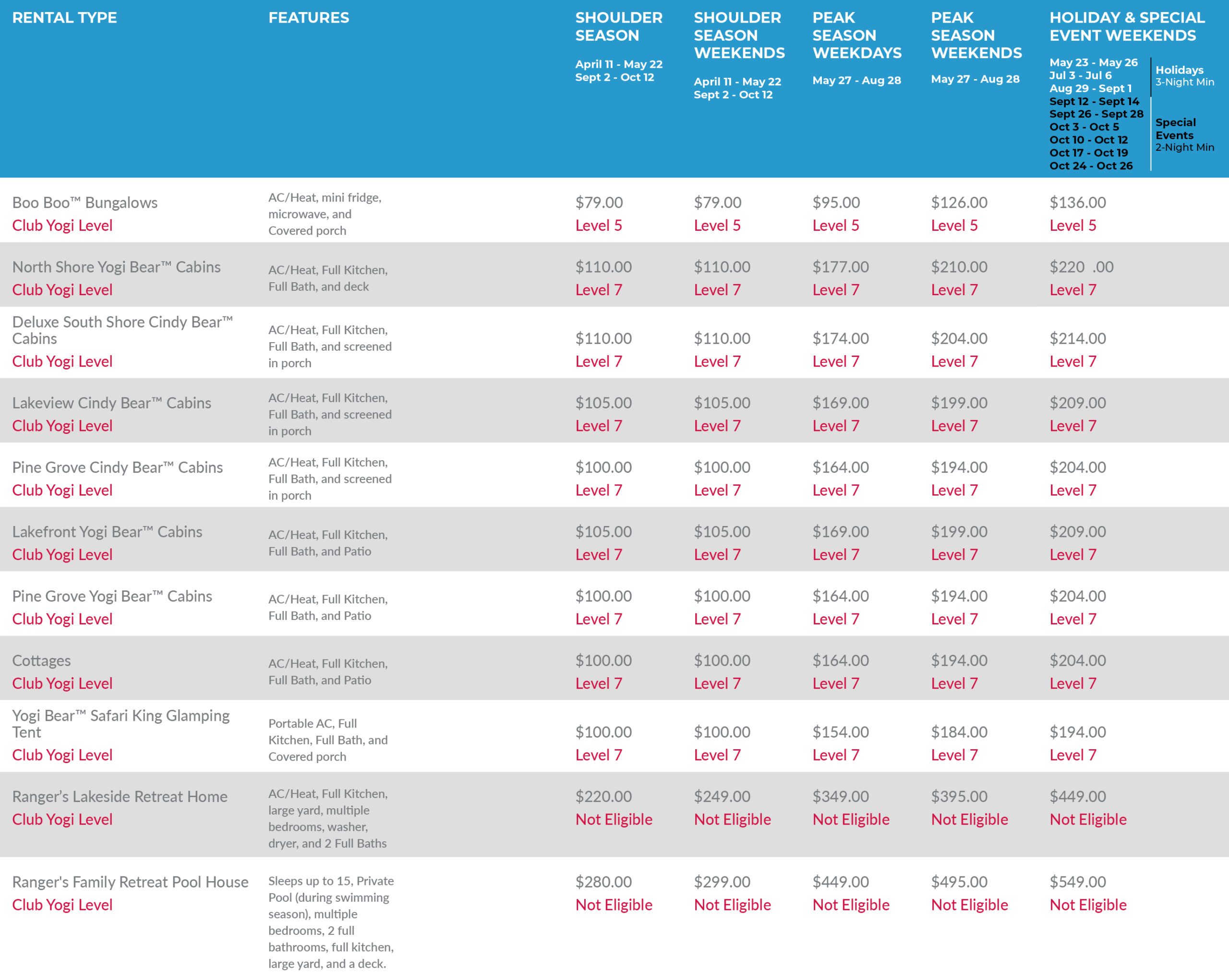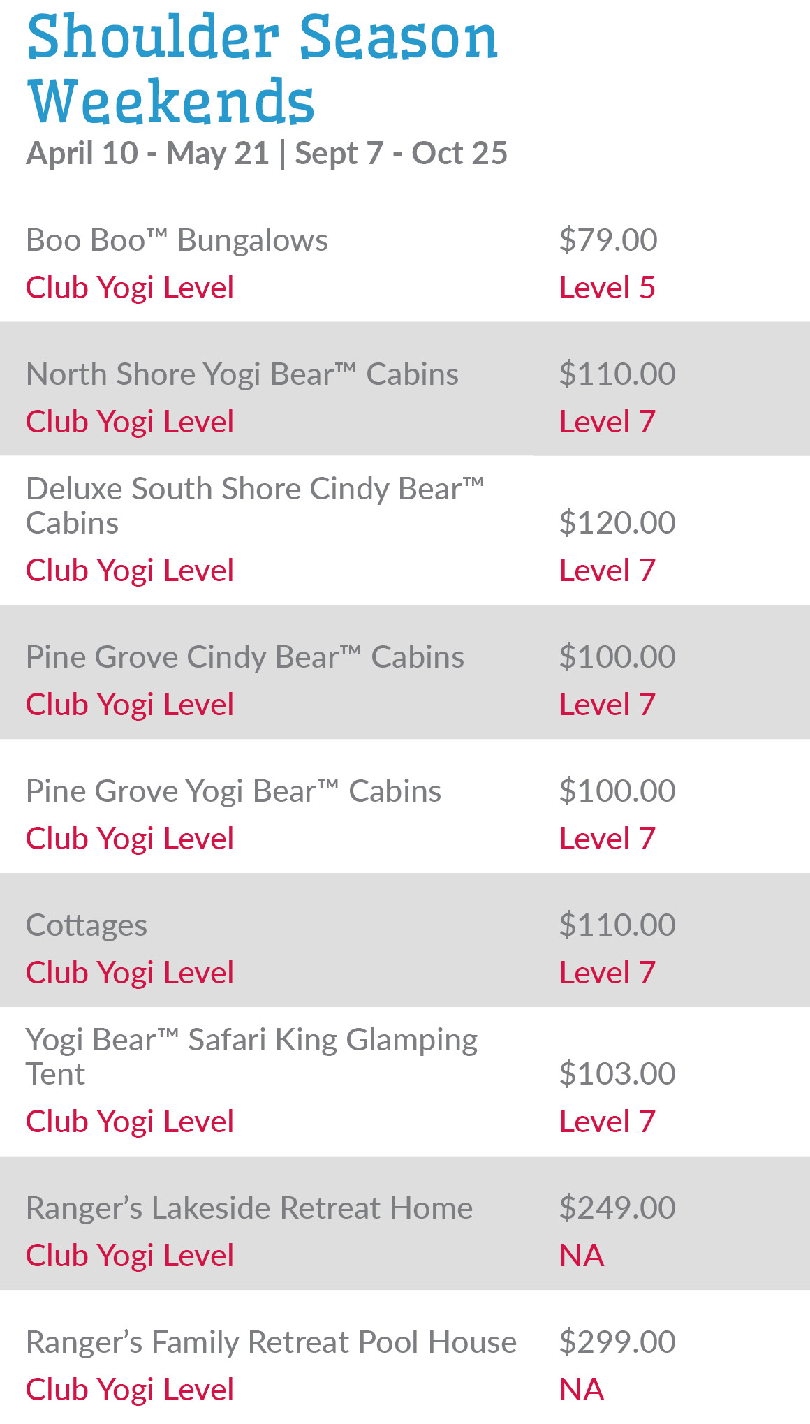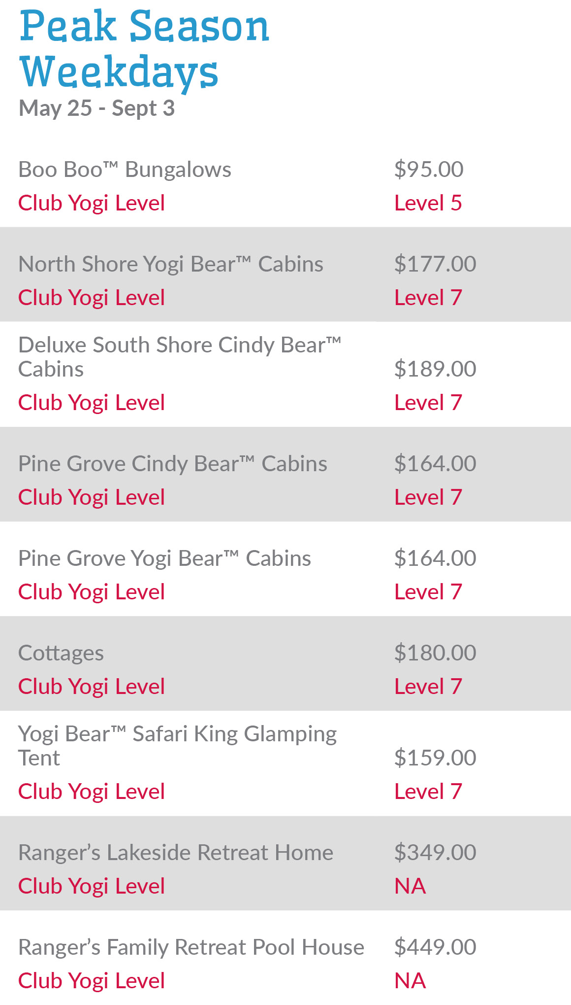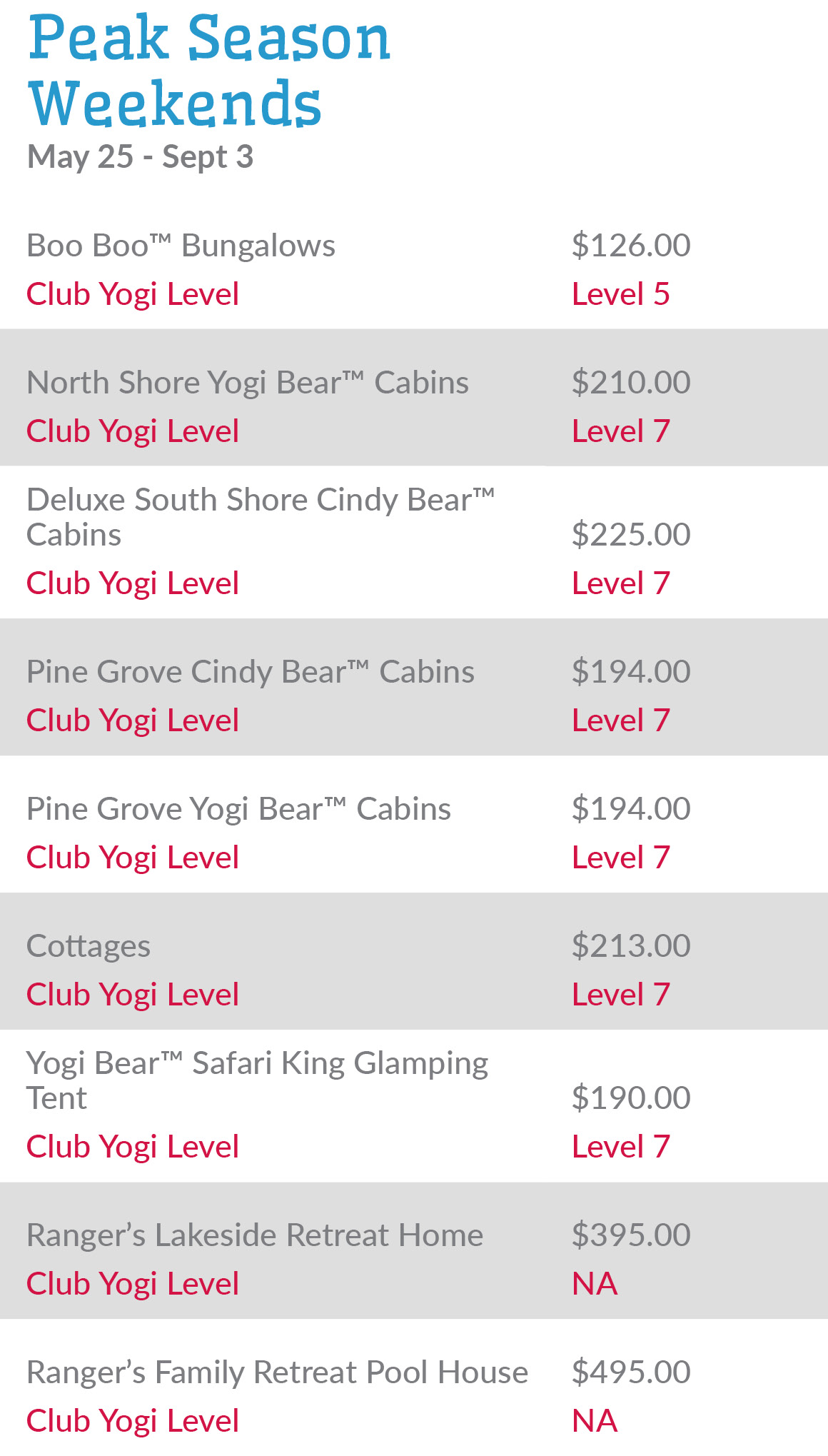 • Boo Boo™ Bungalow, North Shore Yogi Bear™ Cabin, and Pine Grove Yogi Bear™ Cabins Pet Fee: $25.00 per stay / per pet (1 pet max)