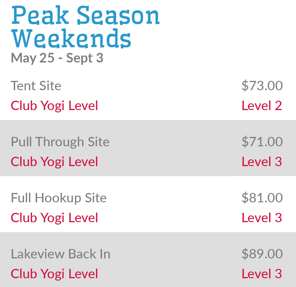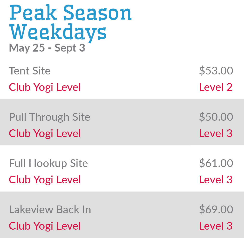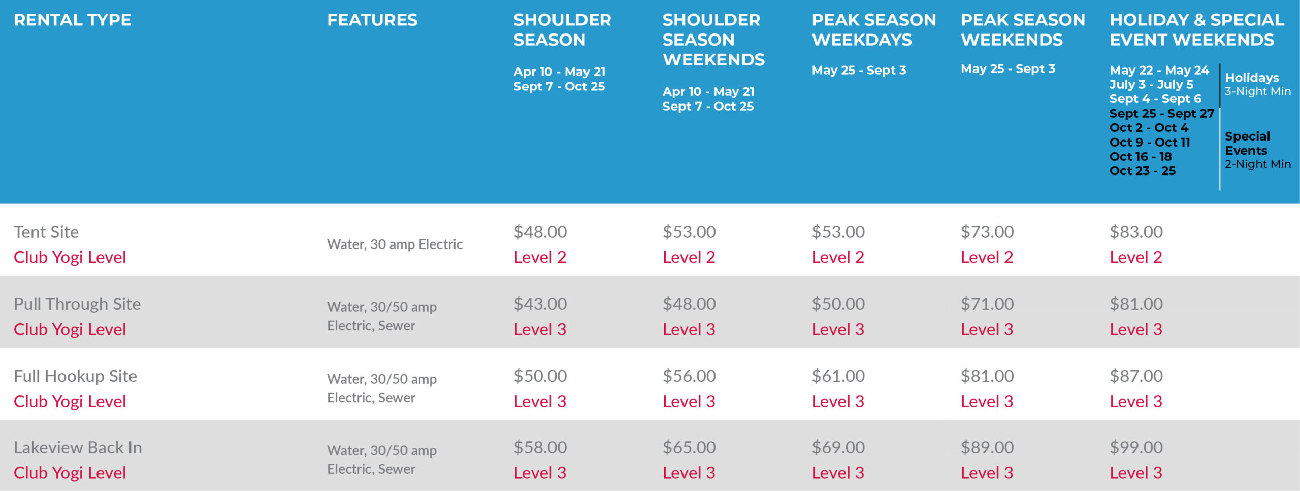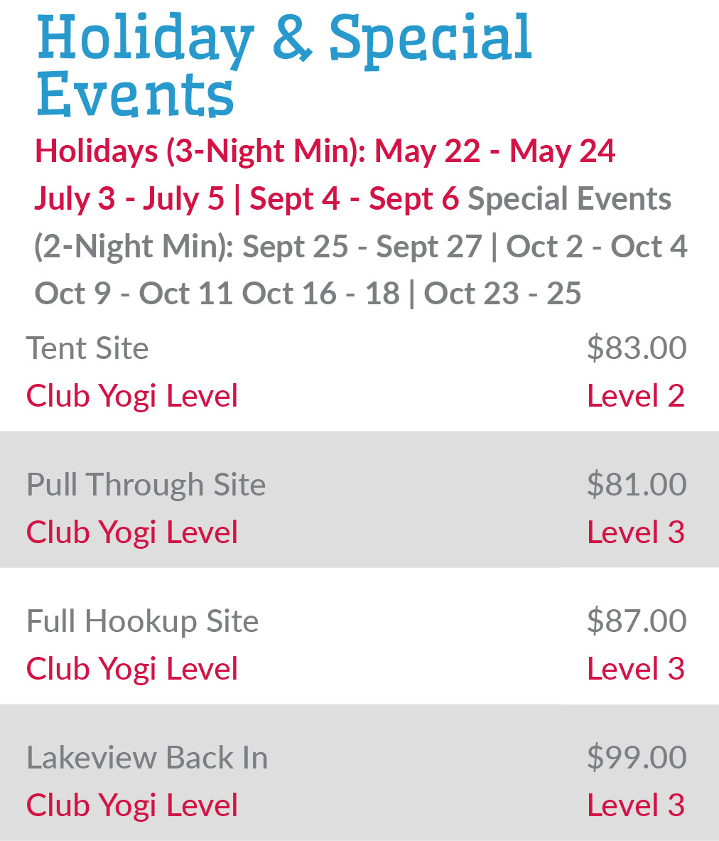 Yogi Bear’s Jellystone Park™ RV Resort at Pine Lakes requires a two-night minimum reservation, three-night minimum reservation for camping or lodging on holidays and special event weekends. All reservations require a 50% deposit at time of booking with the remaining balance due 30 days prior to arrival which we will take automatically with the credit card on file. Special or promotional offers are only valid on non-holiday or special event weekends and cannot be combined with any other offers.