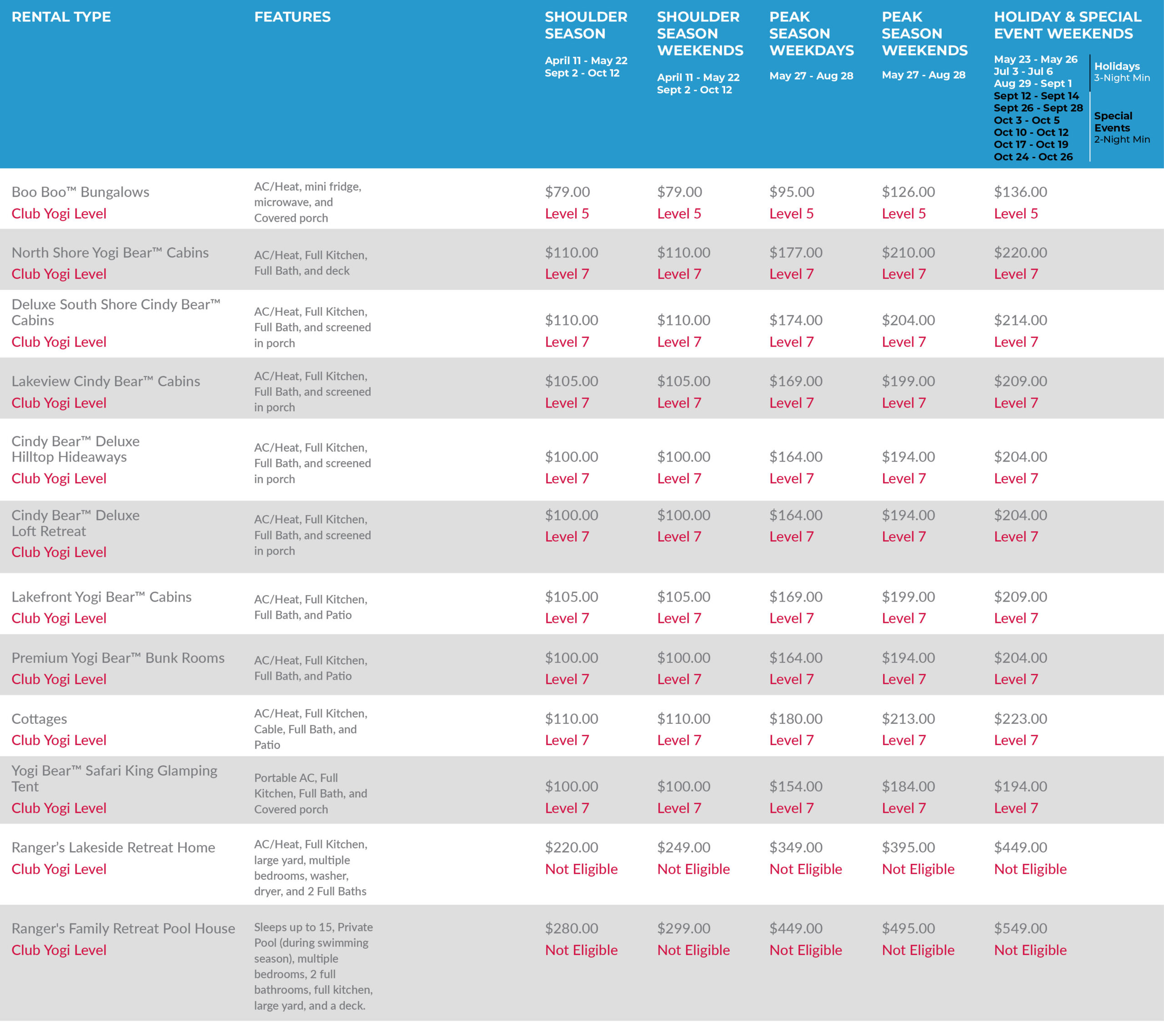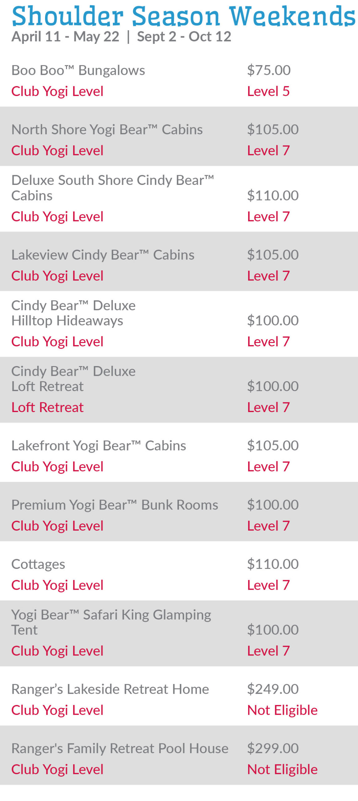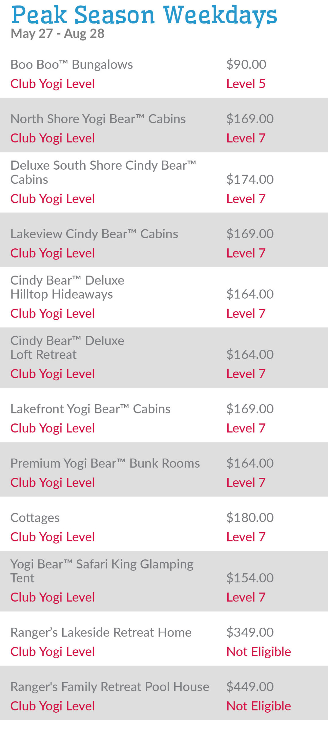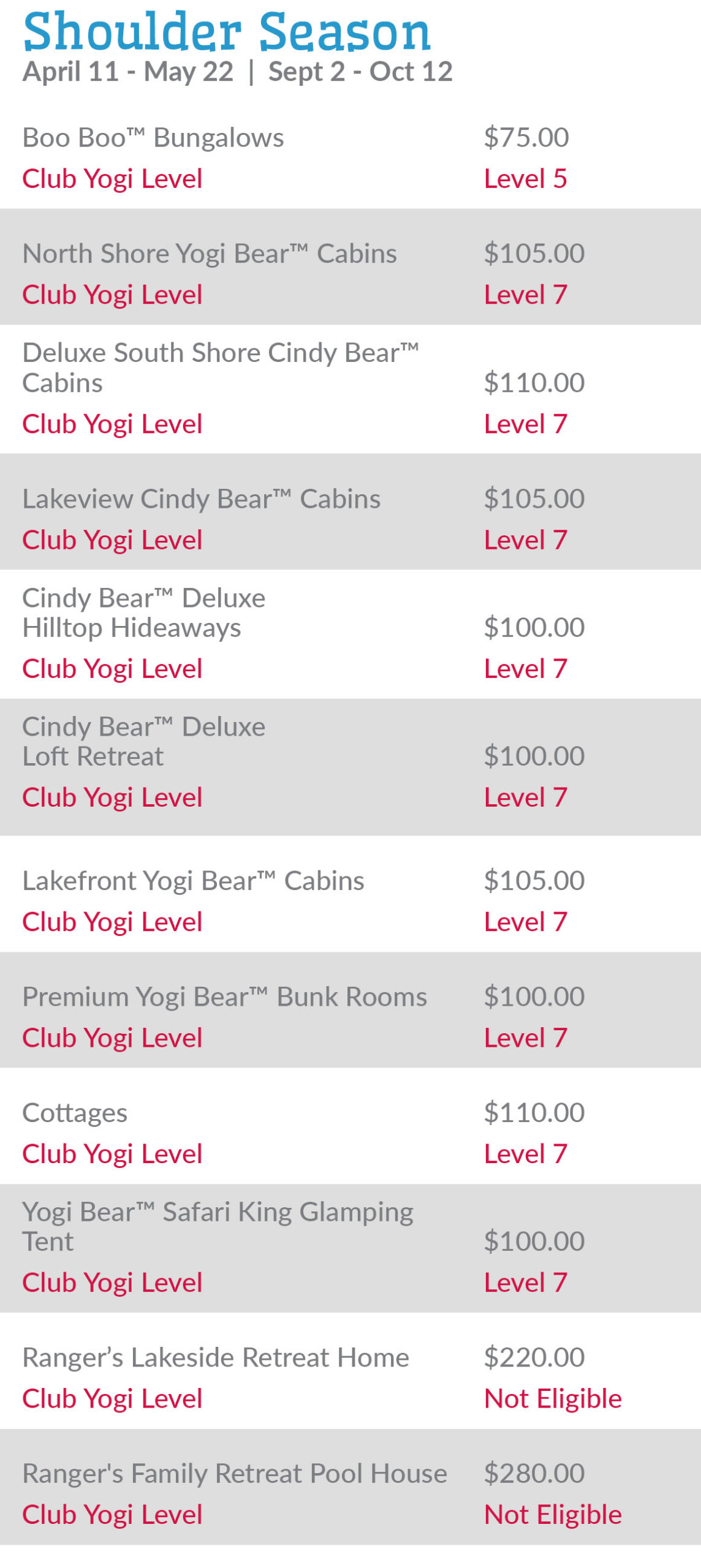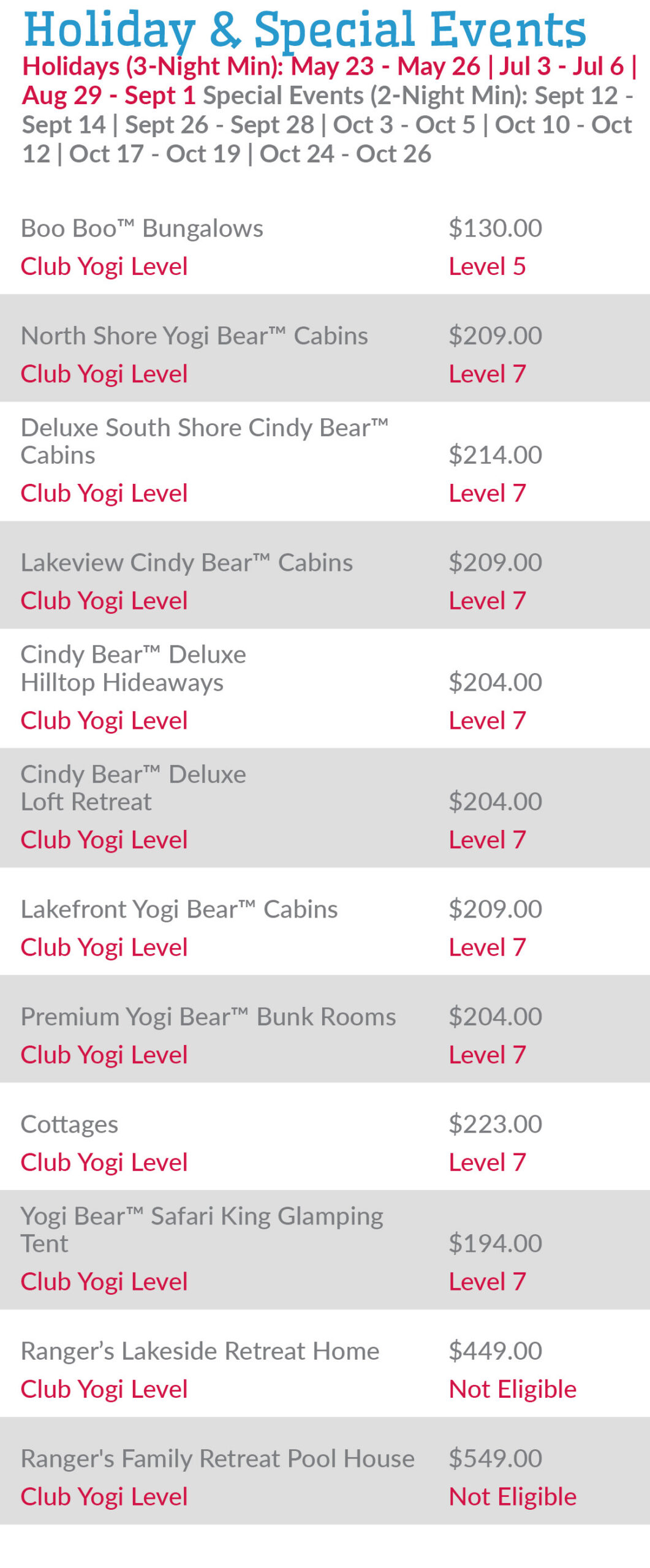 • Rates for North Shore Yogi Bear™ Cabin, Premium Yogi Bear™ Bunk Rooms and Lakefront Yogi Bear Cabins are based on one (1) family. A family is defined as 2 adults and 4 dependent children (17 years old and younger). North Shore Yogi Bear™ Cabin can hold 6 people total with a max of 2 adults.